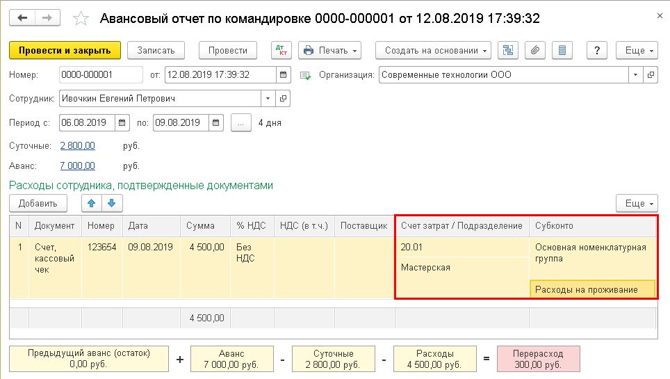 «1С:Бухгалтерия 8»: счета учета затрат в авансовом отчете по командировке