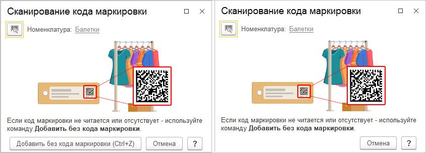 Слева - вид формы, где товар в чек добавляется без ввода марки. Справа – интерфейс формы после дедлайна - прихода даты запрета оборота без марок.