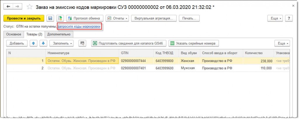 После этих действий в закладке «Товары» вводится ровно столько товарных строк, сколько категорий оставшейся обуви нашлось в магазине, но не более восьми. Каждой строке нужно присвоить код ТН ВЭД из выпадающего перечня (например, 6403999300, 6403999100,  6403999600, 6403999800), вид товара (обуви в нашем случае) и способ введения в оборот. GTIN на оставшийся ассортимент запрашивается через ИС МП с использование гиперссылки, а после этого наименование номенклатуры в соответствующей строке создастся автоматическим образом согласно установленным параметрам. Каждый код остатков начинается с комбинации «029….».