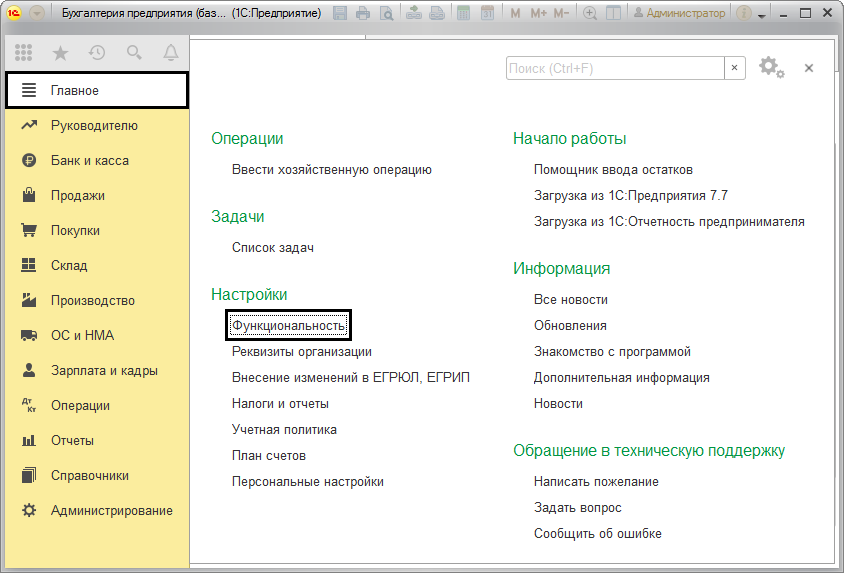• Настроить программу в разделе основного меню «Главная», подпункте «Настройки» и категории «Функциональность».