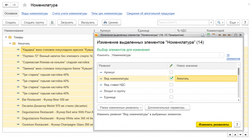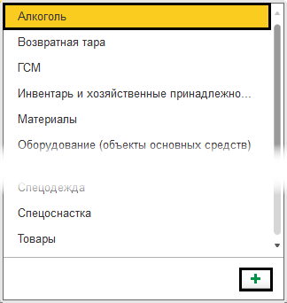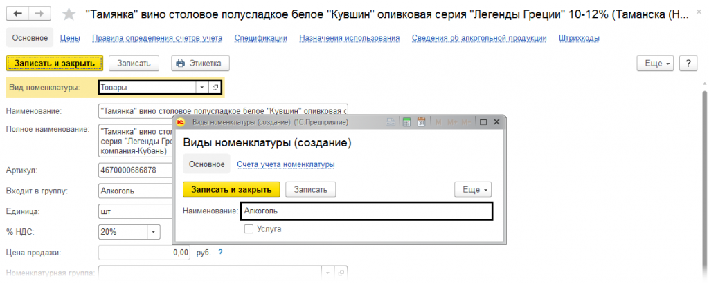 Далее продолжается настройка карточки номенклатуры. В категории «Вид номенклатуры» можно оставить «Товар», либо добавить более подробный элемент (в данном случае «Алкоголь»). Чтобы это сделать, можно нажать кнопку «Плюс-Создать» или «F8» на клавиатуре.