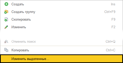 В карточке номенклатуры также можно выполнять групповое изменение требуемых реквизитов и элементов. Для этого необходимо выделить их в справочнике и нажать по ним правой кнопкой мышки. Появится контекстное меню, где нужно выбрать «Изменить выделенные...». Выделение происходит при помощи следующих горячих клавиш: