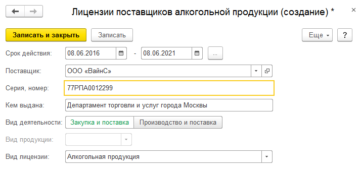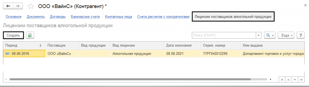Здесь предстоит работать с данными о лицензии поставщиков, чтобы в дальнейшем корректно составлять отчеты. Перейдя по гиперссылке и нажав по кнопке «Создать», можно указать требуемые данные.