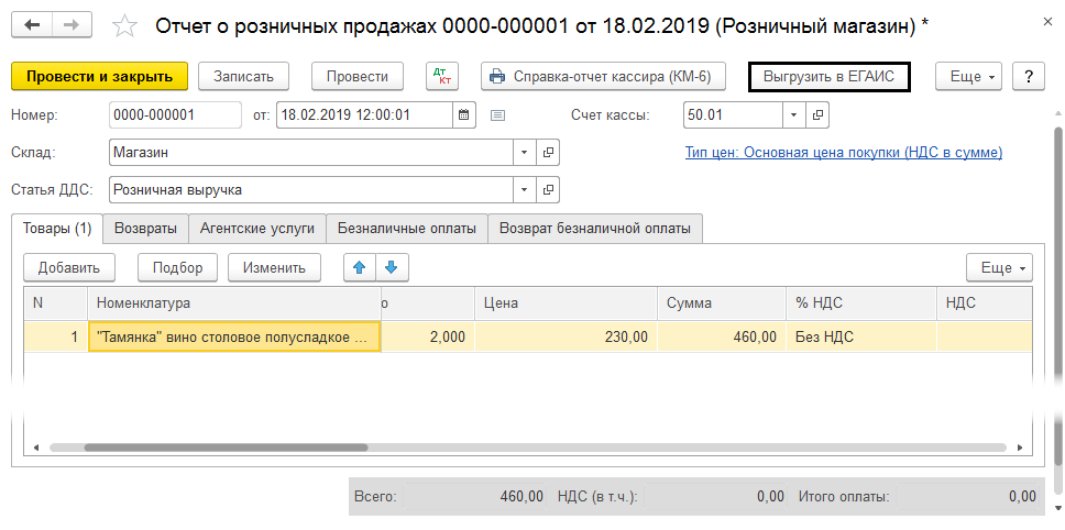 Выполненные действия позволят в дальнейшем указывать данные об алкоголе, создавать отчетные сведения по нему и передавать информацию о продажах в ЕГАИС.