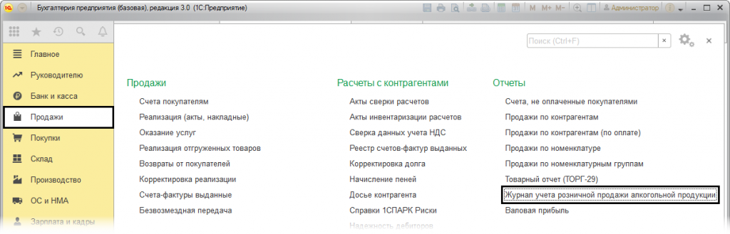 На сегодняшний день поступление и реализация алкогольной продукции сопровождается поштучным или помарочным учетом. Для этого необходимо проводить обмен с ЕГАИС. Это в «1С:Бухалтерия 3.0» можно делать в разделе «Склад-Сервис».