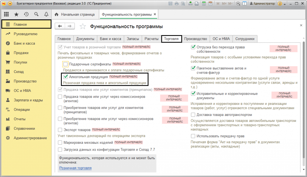 • Перейти в закладку «Торговля» и проверить наличие установленного флажка в поле рядом с «Алкогольная продукция».