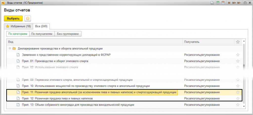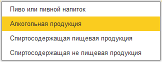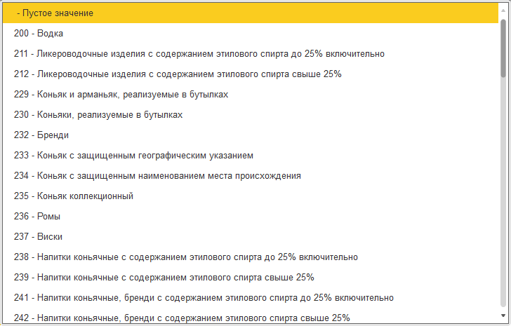 Нажав на поле «Вид продукции», откроется полный перечень возможных разновидностей алкоголя. Необходимо выбрать требуемый вариант.