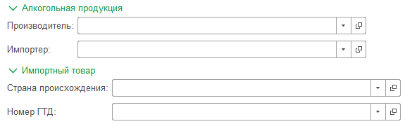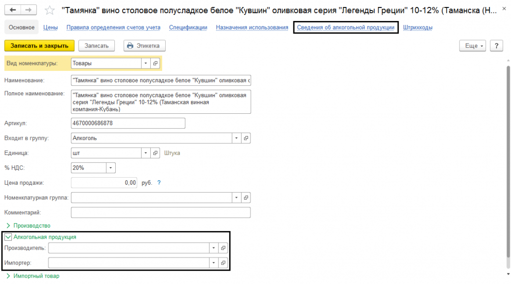 Для учета любой продукции в системе 1C понадобится заполнять номенклатуру. В данном случае, после настройки нужных параметров, в карточке появится необходимый раздел «Сведения об алкогольной продукции» для дальнейшей работы. В предоставленной карточке нужно будет указать название производителя, а также импортера, если потребуется.