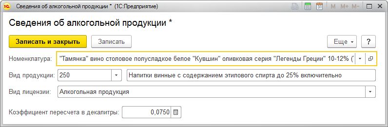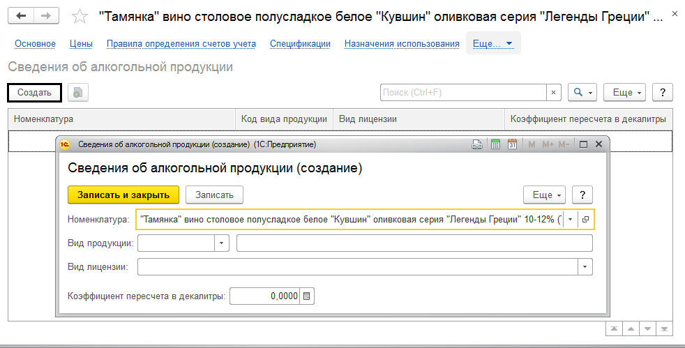 Гиперссылка «Сведения об алкогольной продукции» располагается в верхней части номенклатурной карточки. Переходим по ней и нажимаем на кнопку «Создать». После откроется новое окно, в котором следует указать дополнительные сведения о товаре. Такой информацией является вид продукции, ее лицензия и коэффициент пересчета в декалитры.