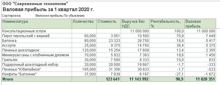 Если использовать отчет по умолчанию, первыми будут выведены товары, которые реализованы с максимальной валовой прибылью.