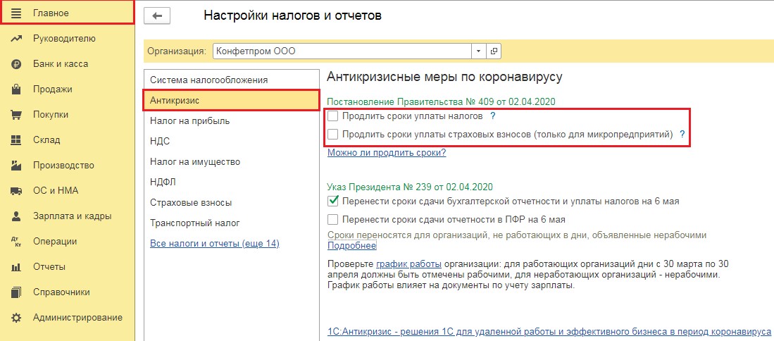 Чтобы внести изменения, нужно в программе 1С: Бухгалтерия в разделе «Главное» выбрать вкладку «Налоги и отчеты». После этого будет отображен список, из которого следует выбрать пункт «Антикризис». Для того, чтобы осуществить коррективы, необходимо поставить флаг в окошке возле «Продлить сроки уплаты налогов»