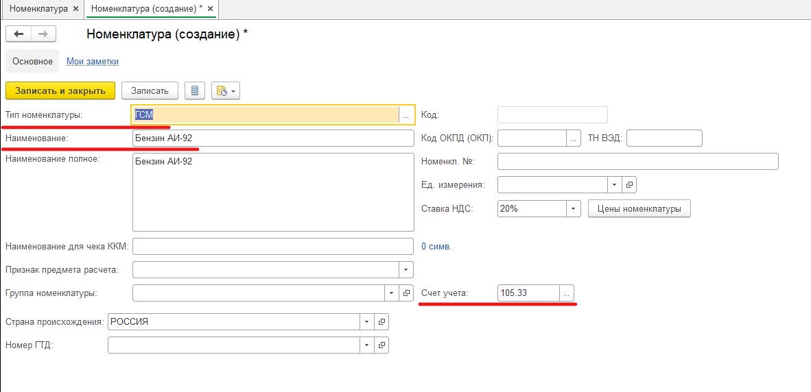 Необходимо уделить внимание правильному заполнению полей "Тип номенклатуры" ГСМ и "Счет учета" 105.33. От данных сведений зависит корректность заполнения документации.