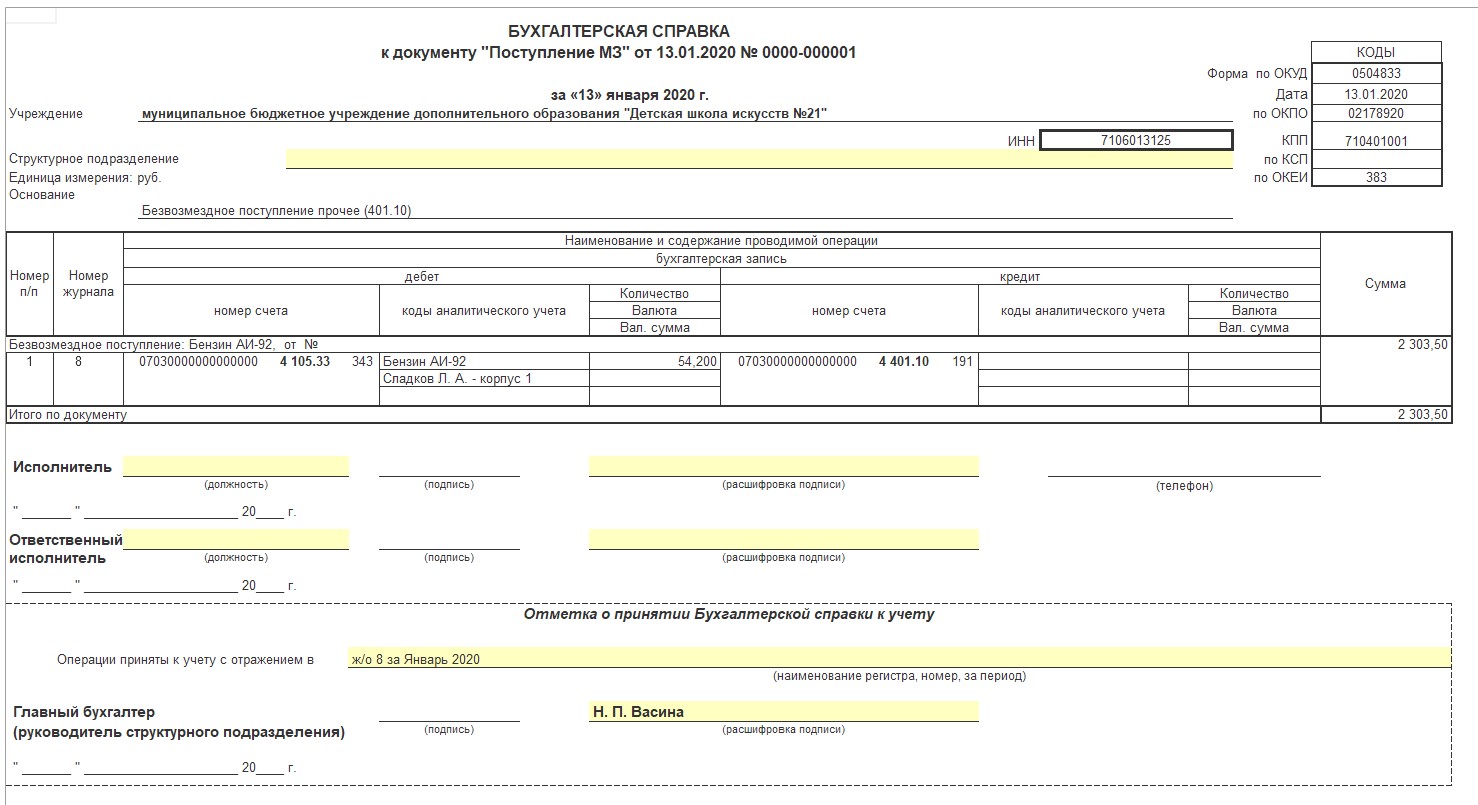 Рассмотрим ситуацию на примере поступления бензина безвозмездно в программном обеспечении 1С:Бухгалтерия государственного учреждения редакции 2.0.