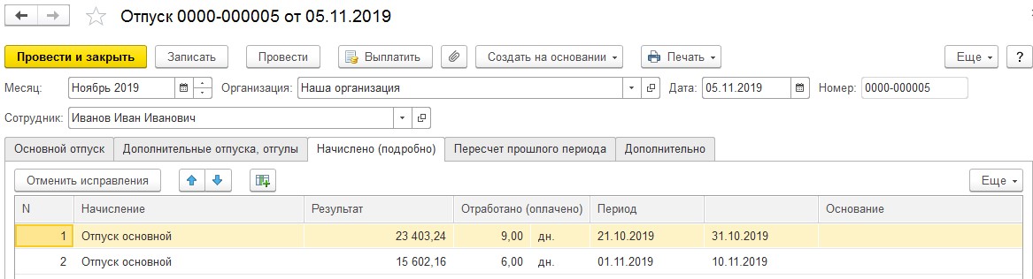 Заходим в первоначальный документ «Отпуск» и нажимаем на «Исправить». В новом документе нужно будет указать совершенно новый период начисления (то есть, ноябрь). Внесём изменения в дату конца отпуска, при этом увеличив её на необходимое нам количество дней. И учитывая тот факт, что мы уже ввели больничный лист, в котором уже произошло исправление дней пересечения, программа сразу же и автоматически произведёт пересчёт отпускных начислений.