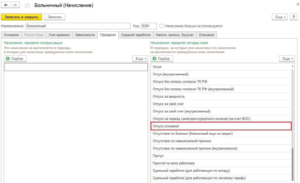 Для того, чтобы произвести перерасчет дней отпуска, нам необходимо сделать в системе начисления по больничному листу. В программе это можно реализовать с помощью приоритетности начислений.