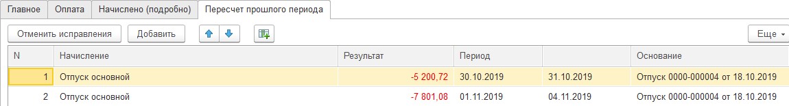 Далее перейдем к анализу раздела «Пересчёт прошлого периода». Программа исправит начисление отпуска за те дни, когда произошло пересечения его с отсутствием по больничному листу.