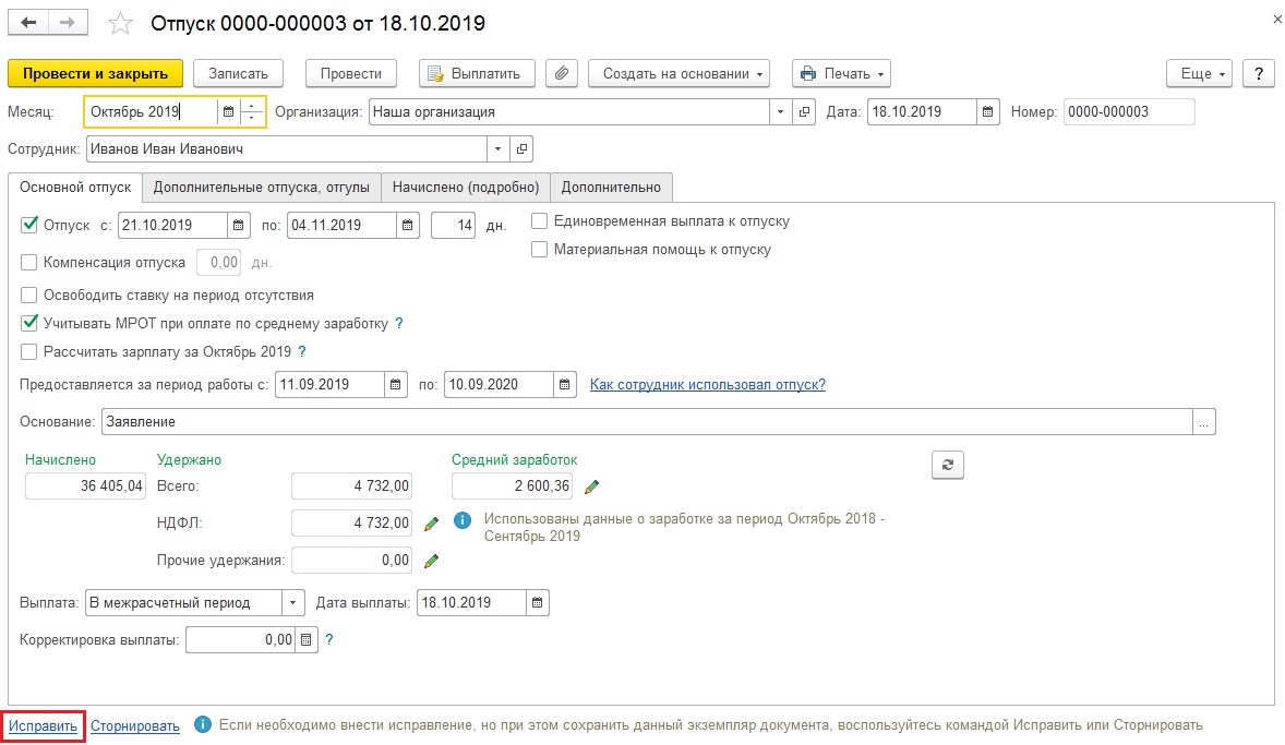 - Если больничный, отпуск и продление отпуска выпадает на один расчётный период, заходим в первоначальный документ «Отпуск» и в левом нижнем углу данного документа нажимаем на ссылку «Исправить».