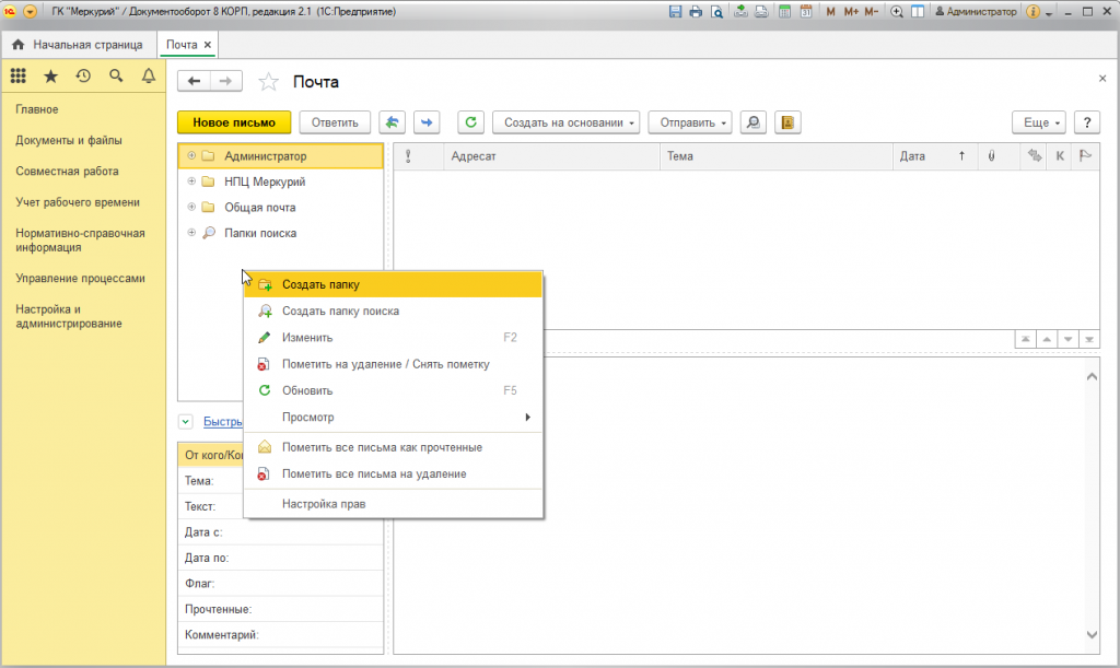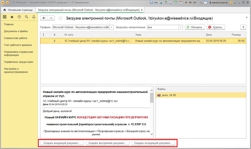 Внимание: в системе 1С:Документооборот 8 ПРОФ встроенная почта отсутствует.