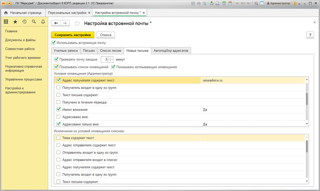 Как видно, 1С:Документооборот 8 КОРП позволяет пользователям задавать множество различных настроек для встроенной системной почты.