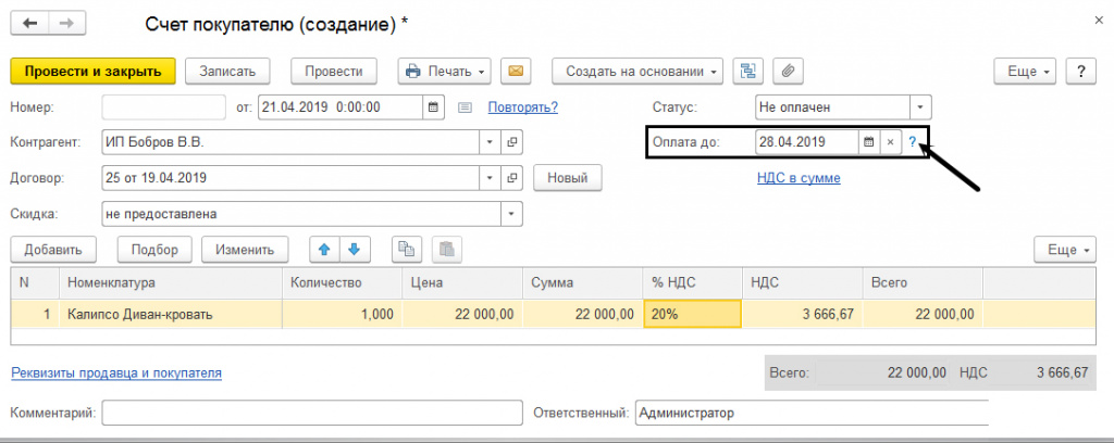 Еще один момент: сроки оплаты могут определяться договором – в этом случае в разделе «Расчеты» необходимо установить галочку в строке «Установлен срок оплаты».