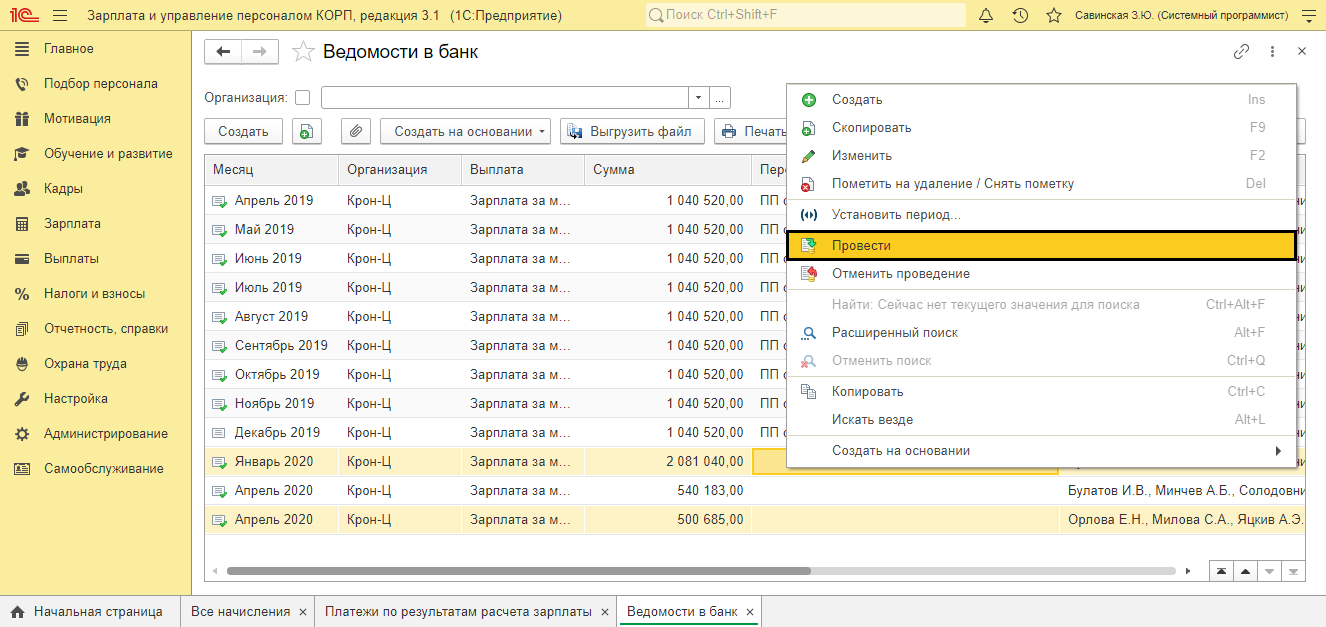 Также можно перепровести документы в 1С:ЗУП 8.3 из журнала документов. Активировать команду «Провести» можно с помощью кнопки «Еще», которая находится в журнале документов и в контекстном меню. Открыть окна этих меню надо, кликнув на правую сторону мышки на документах с выделением. Для выделения файлов воспользуйтесь этими функциональными клавишами: