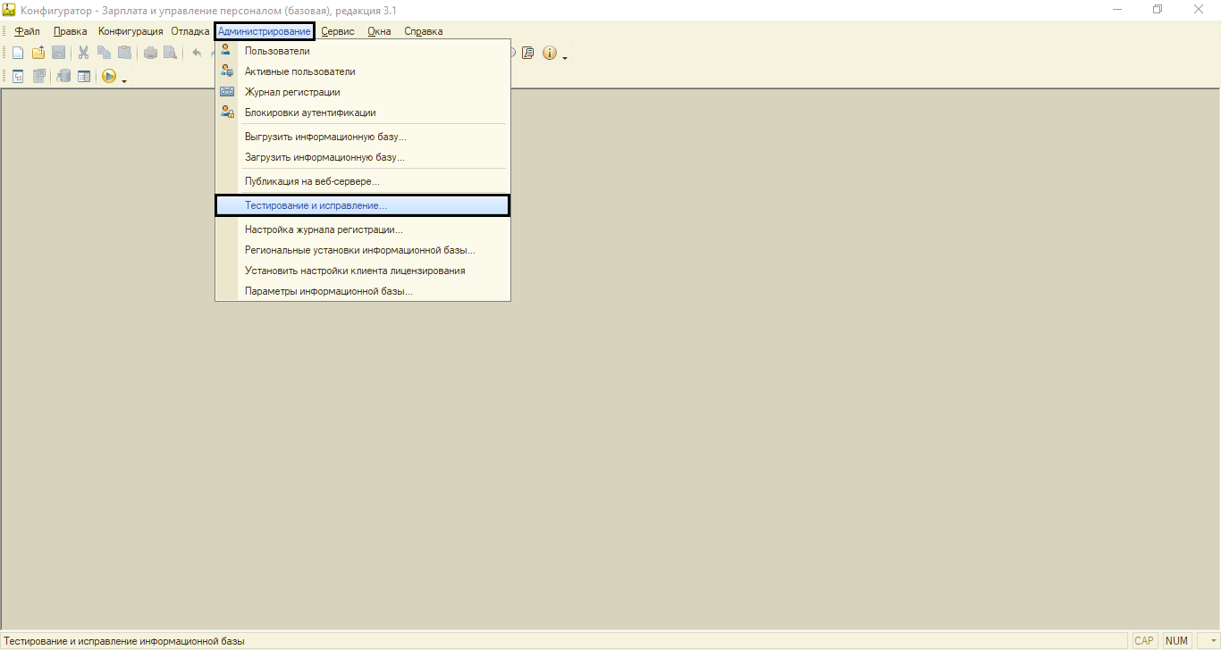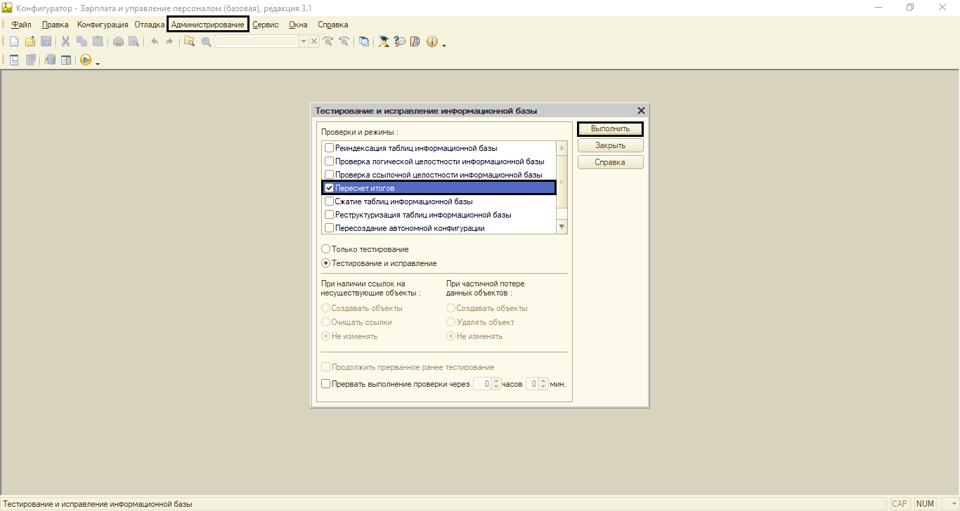 Иногда даже перепроведение документов не дает нужного результата. В программе 1С можно совершить еще одну процедуру – «Пересчет итогов». Мог произойти какой-то сбой, поэтому данные записей реестров и начали отражать некорректную информацию. Последствия сбоя можно исправить, выполнив «Пересчет итогов» в режиме «Конфигуратор». В самом конфигураторе нажмите на пункт меню, который называется «Администрирование – Тестирование и исправление».