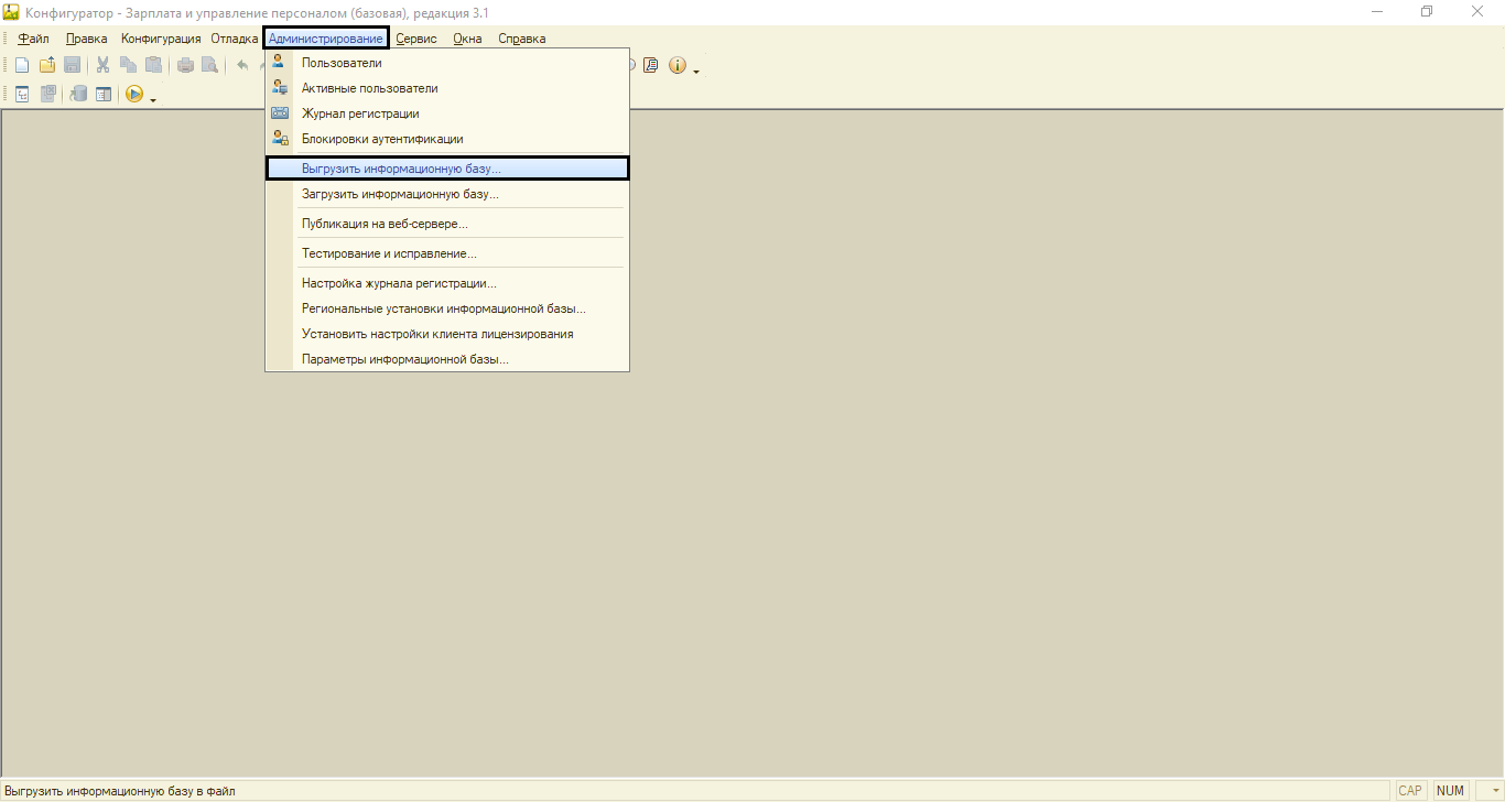С помощью окна запуска программы в разделе «Конфигуратор-Администрирование» также есть возможность создания резервной базы, но здесь необходимо владеть расширенными правами.