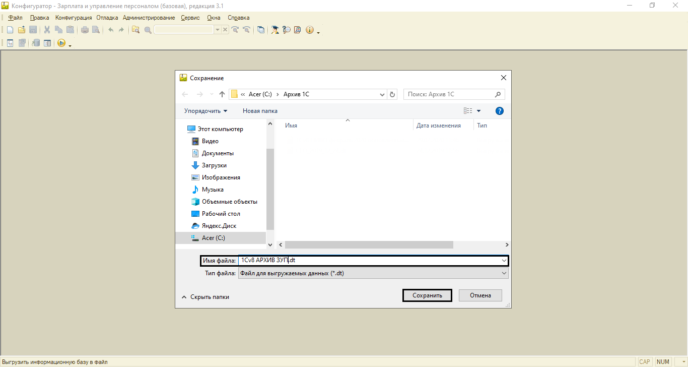 Проделать эту операцию можно в режиме «1С:Предприятие», выбрав опцию «Администрирование-Обслуживание», где необходимо перейти по предоставленной ссылке. Важно указать, а также запомнить место хранения базы. На этом мы завершаем операцию.