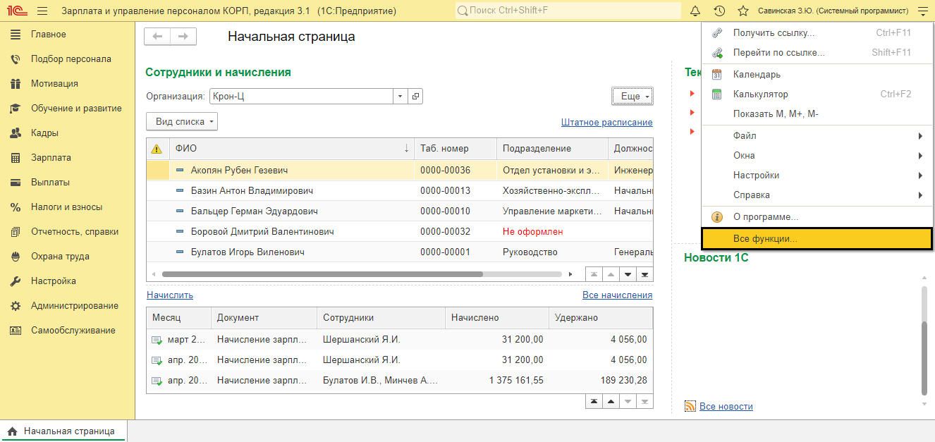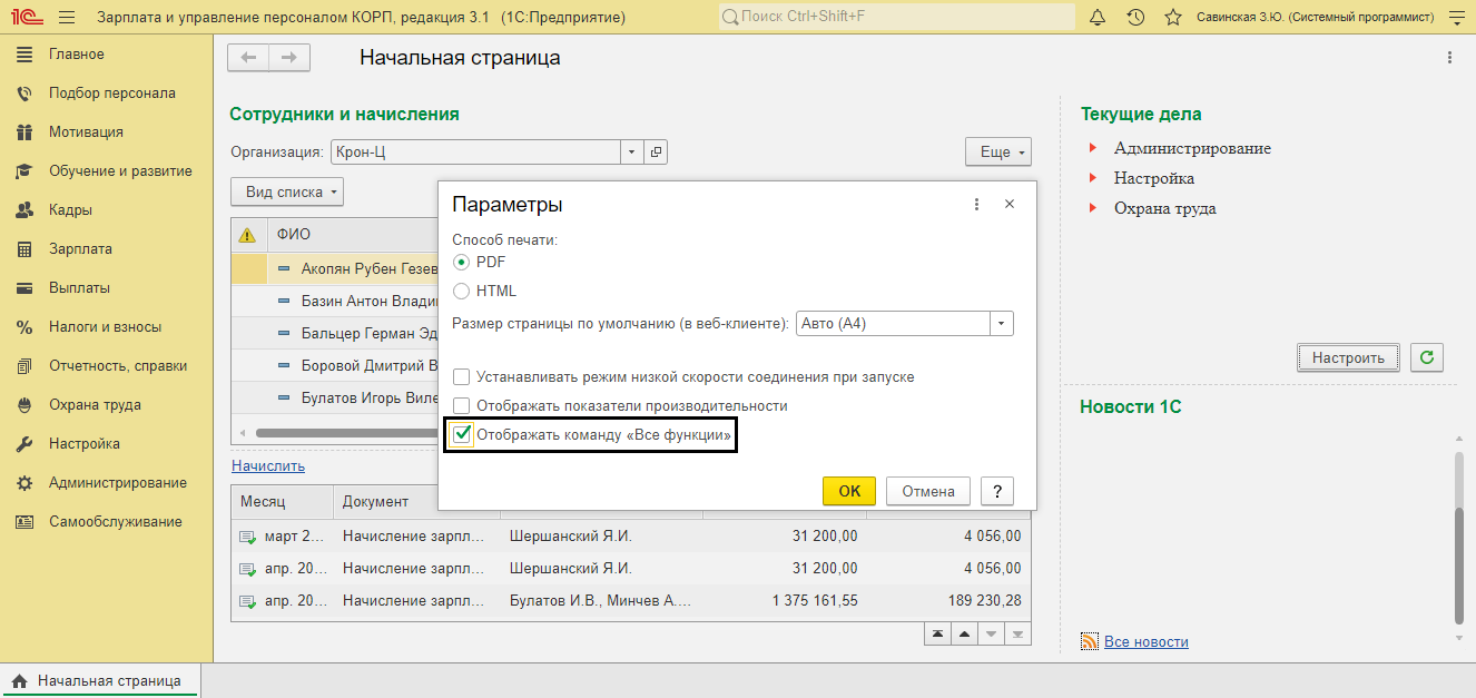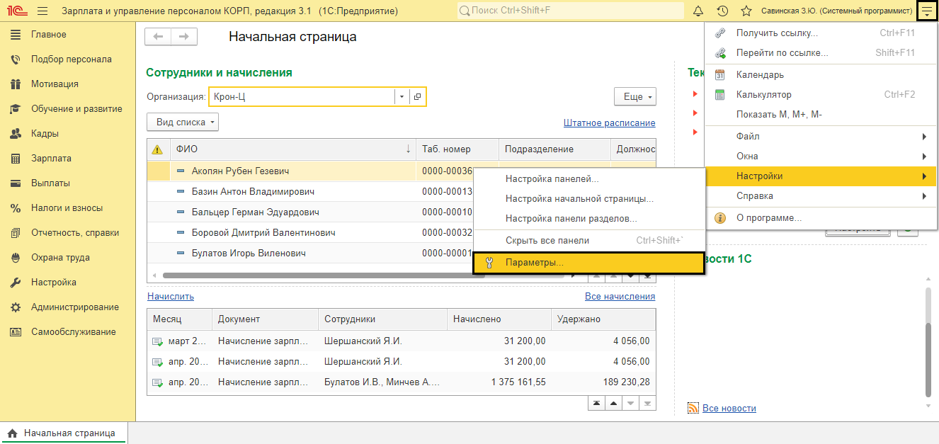 Групповое перепроведение документов в 1С:ЗУП 3.1 происходит с помощью осуществления особой обработки, которую необходимо найти в главном меню программы. Отыщите стрелочку в правом верхнем углу строки наименования программы. Если отображения панели всех функций нет в меню, то ее можно активировать в настройках. Найдите в меню раздел «Параметры» и поставьте соответствующую галку.