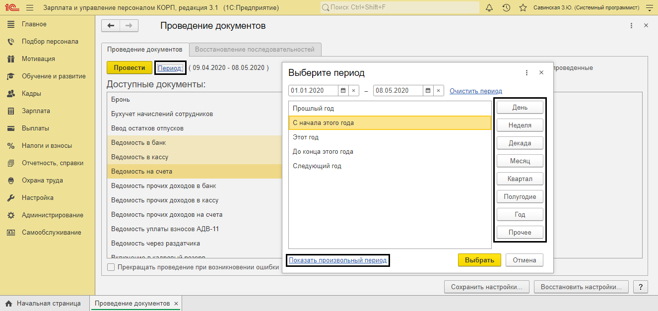 Шаг 5. Откроется окно для выбора. Введите период проведения файлов. Есть возможность выбрать период, предложенный системой, или самостоятельно ввести произвольный период для проведения документов.