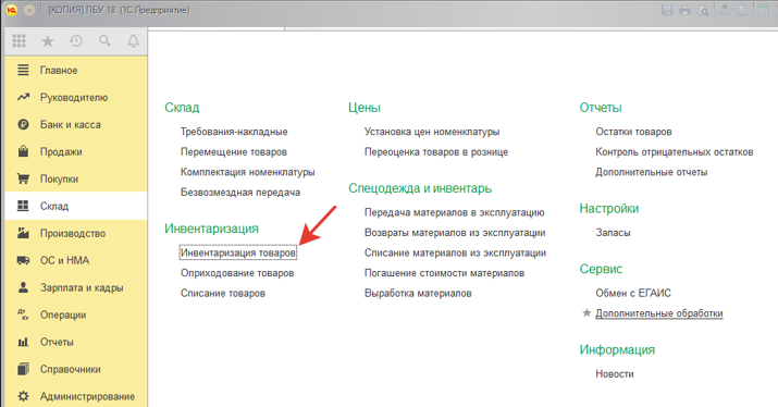 Есть такой важный момент: в «Инвентаризации товаров» невозможно формировать проводки. Если вы хотите отразить все моменты в учете касательно излишков и недостачь то нужно прибегать к другим документам — «Списание товаров» и «Оприходование товаров». Их вы найдете в том же разделе. Нужно зайти сначала в «Склад», а потом нажать на «Инвентаризация».