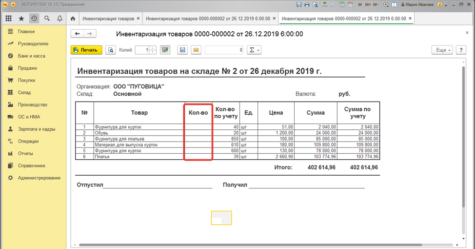 Что дальше требуется от вас? Вы должны написать, сколько материальных ценностей осталось на складе. Это должно быть фактическое количество. Чтобы это сделать, можно документ «Инвентаризация товаров на складе» отправить на печать, а после удалить из графы «Количество» все данные, а далее выдать документ работникам, которые входят в инвентаризационную комиссию. Они пересчитают ТМЦ и запишут цифру вручную: