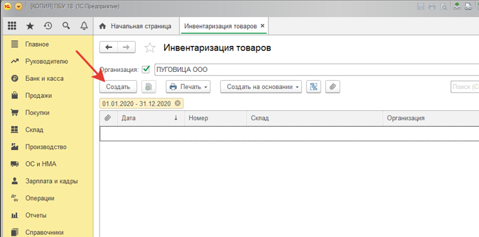 Где найти документы инвентаризации? Для этого в 1С сначала отыщите раздел «Склад» – «Инвентаризация». Чтобы создать нужный вам новый документ, нажмите на «Инвентаризацию товаров». Посмотрите, как это можно сделать на примере: