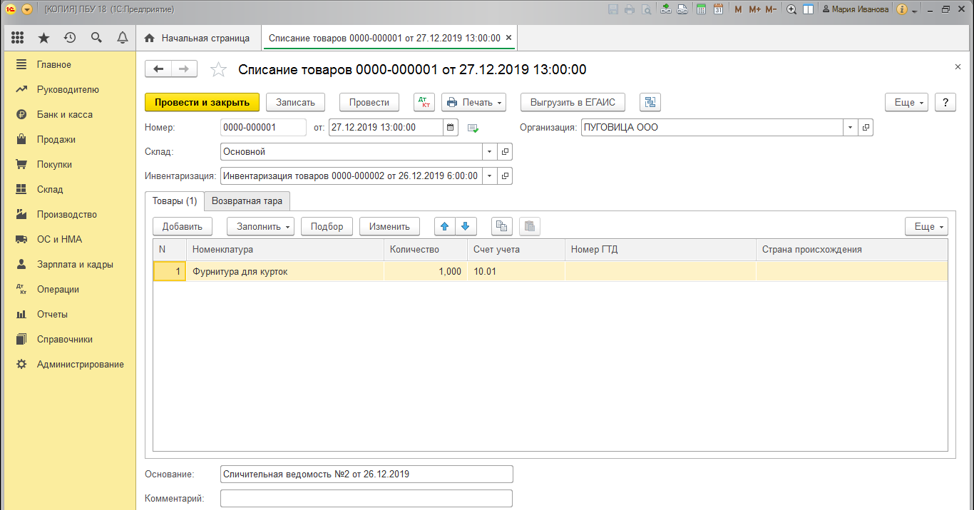 Эти два документа можно заполнить в автоматическом режиме. За основание берутся данные из «Инвентаризации товаров». Для этого нажмите «Создать на основании».