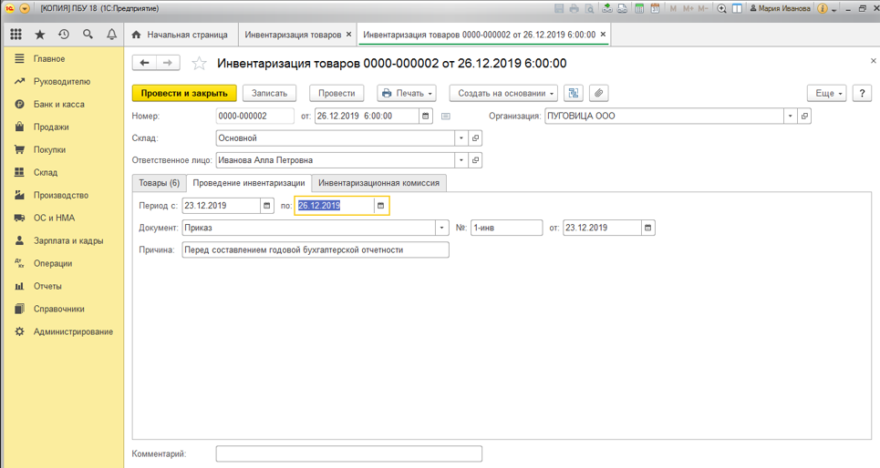 Ни одна процедура инвентаризации не происходит сама по себе. Она имеет документальную подоплеку. Перед тем, как ее проводить, создается приказ. Вы можете распечатать готовый приказ, но перед этим вам нужно внимательно заполнить вкладки «Проведение инвентаризации», а также — «Инвентаризационная комиссия».