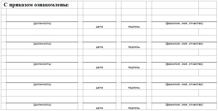 Помните о том, что в программном бланке не существует поля, позволяющего ознакомиться с приказом. Не спешите печатать, сначала внесите в форму вот такое поле: