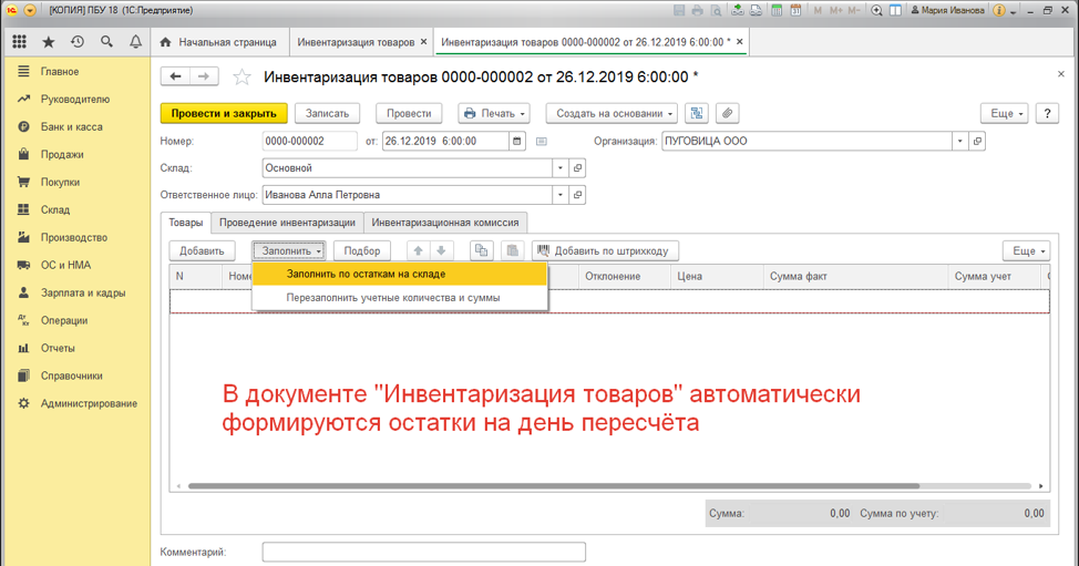 Зайдите в документ и заполните вкладке «Товары». Туда нужно внести учетное количество ТМЦ на складе. Чтобы произвести процедуру, необходимо нажать на слово «Заполнить», а после — «Заполнить по остаткам на складе». Эти пункты расположены прямо над таблицей: