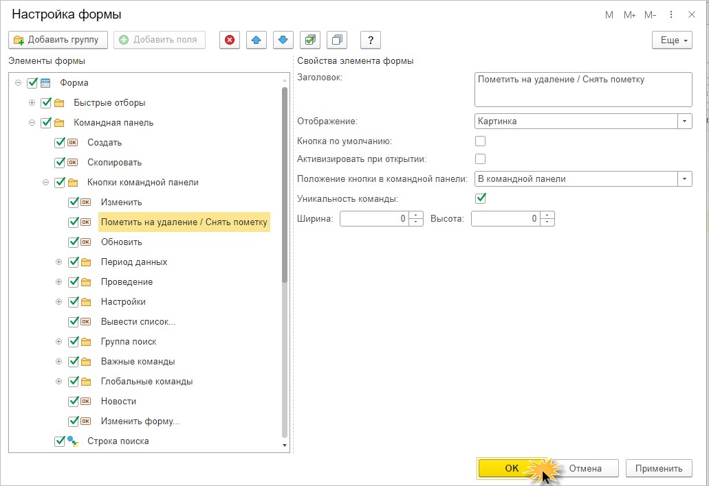 Добавляем на панель кнопки «Провести», «Пометить на удаление/Снять пометку на удаление» и «Отменить проведение».