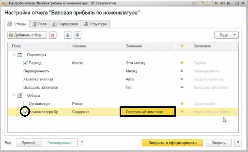 На вкладке «Отбор» для поля «Номенклатура. Краткое наименование» нужен отбор по условию, что «Краткое наименование» содержит какую-то определенную фразу. Кроме того, можно выполнить отбор по полям реквизитов, которые есть в составе агрегатных полей.
