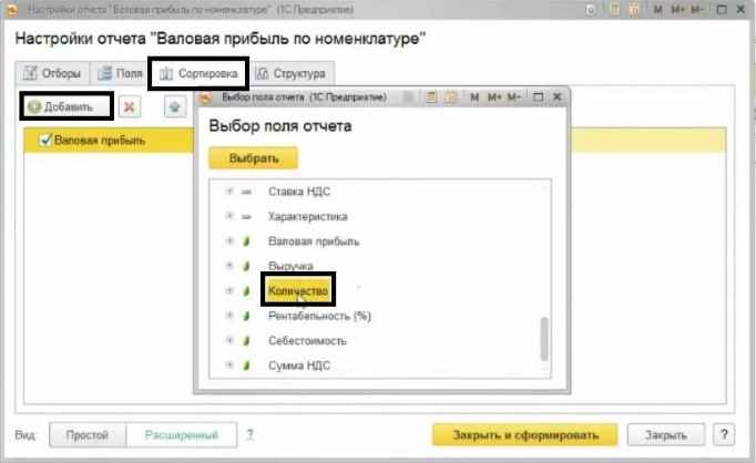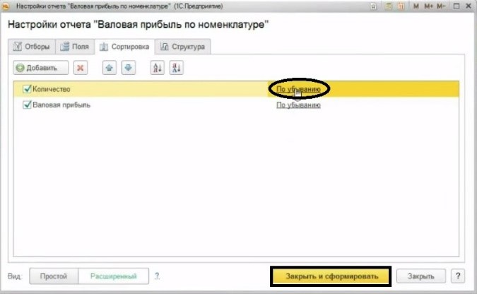 В настройке нужно будет добавить информацию по количеству на вкладке «Сортировка». Выбираем признак сортировки «По убыванию».