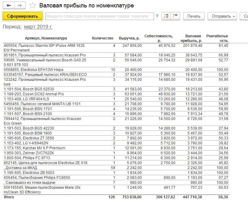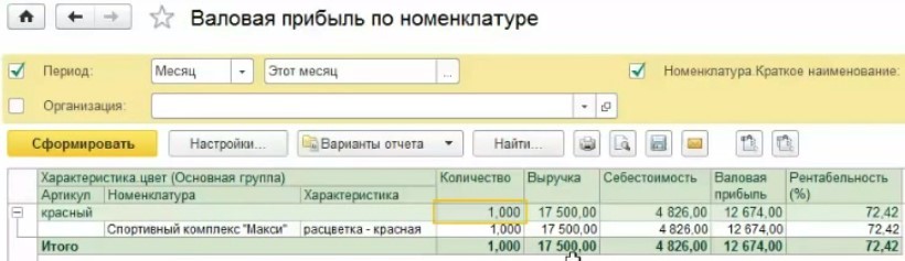 Чтобы сформировать нужный документ, в разделе «Анализ» необходимо зайти в отчет «Валовая прибыль по номенклатуре».