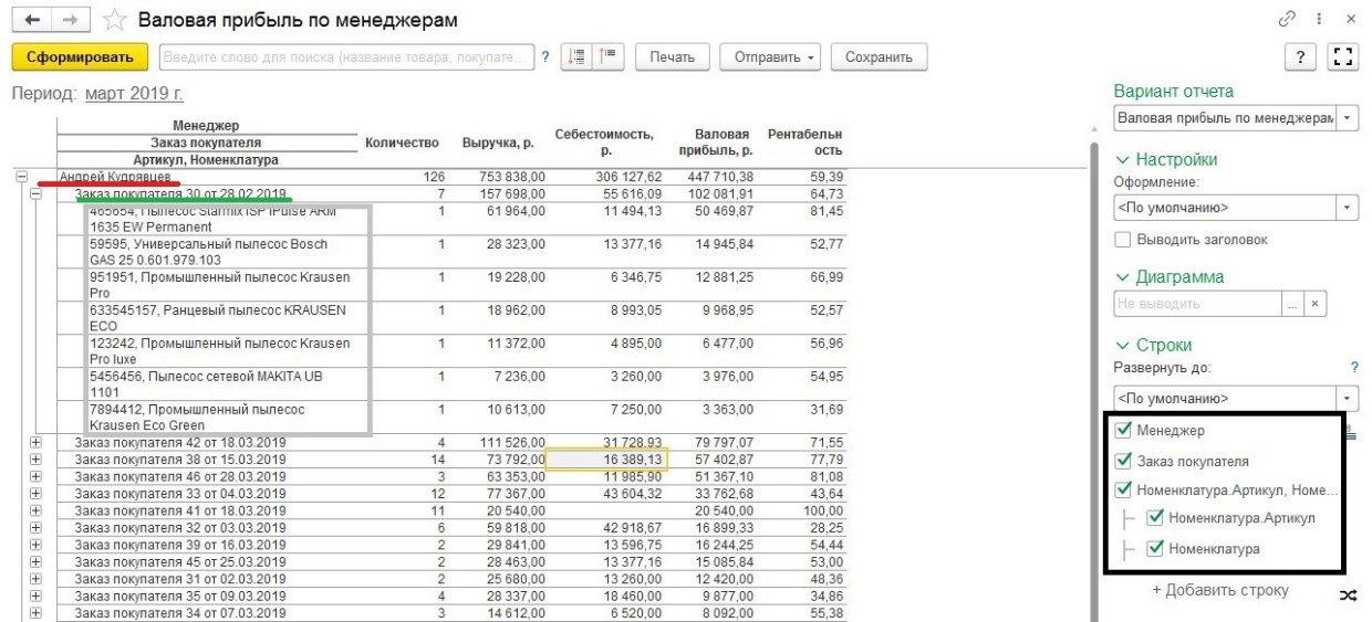 Эту информацию руководитель может увидеть из стандартного отчета в системе «1С:Управление нашей фирмой 8.3» - «Валовая прибыль по менеджерам». Автоматически отчет здесь сформируется по всей номенклатуре. Но если вам надо отобрать конкретную номенклатуру, то придется выполнить некоторые настройки. Через расширенный вид следует установить отбор номенклатуры по наименованию и выбранному условию.