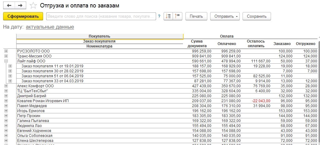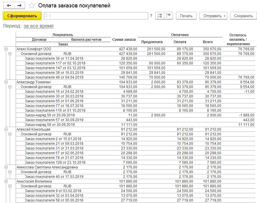 Отчеты в программе могут показать, по каким заказам покупатель заплатил не всю сумму, и сколько конкретно остается, чтобы закрыть задолженность.