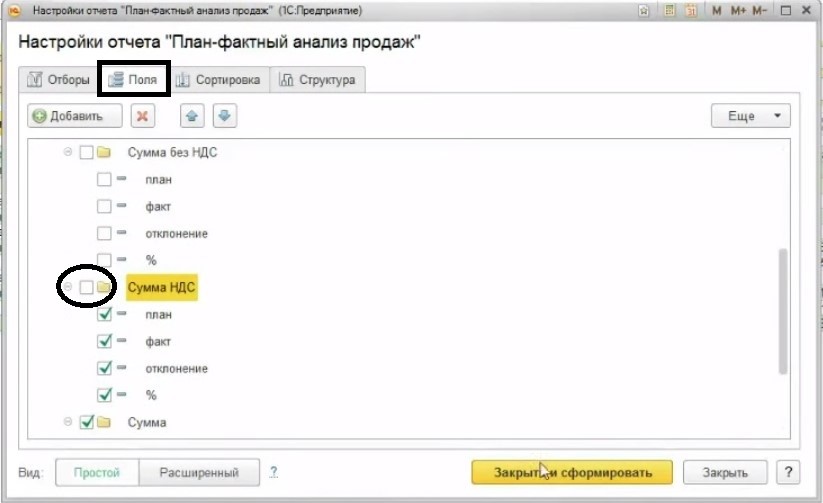 Если нужны данные без НДС, то через настройку группе «Поля» есть возможность включать и отключать различные колонки данных. Поэтому, когда вы отключите «Сумма НДС», в отчете не будет отражаться информация об НДС.