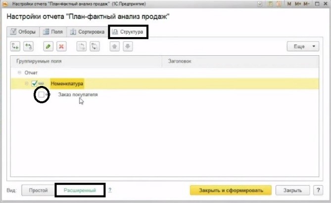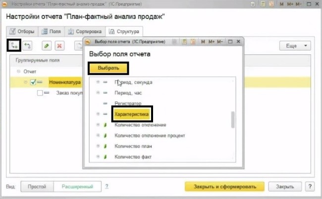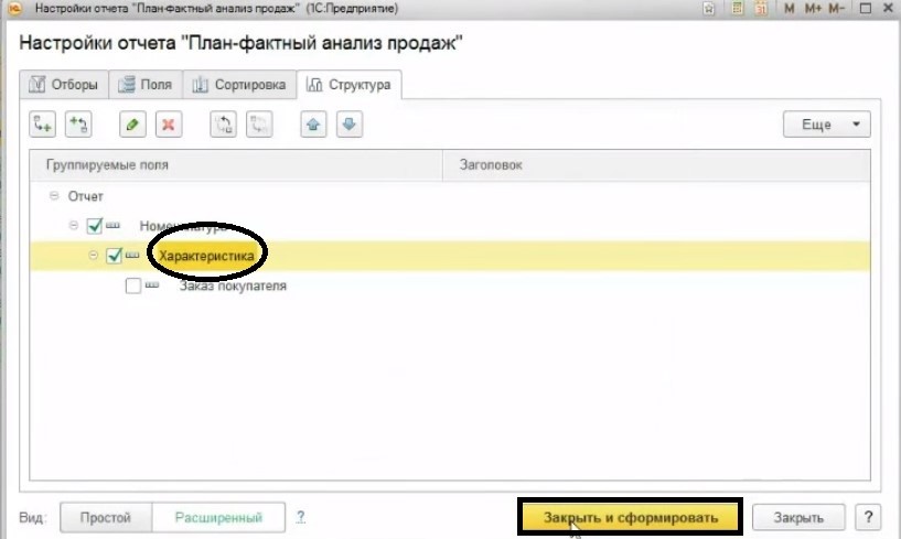 Для этого снова нужно произвести некоторые настройки в отчете «План-фактный анализ продаж». Во вкладке «Структура» выберите расширенный вид настройки. Далее нужно отключить группировку «Заказы покупателей», а затем добавить группировку «Характеристика». После чего сформировать отчет.