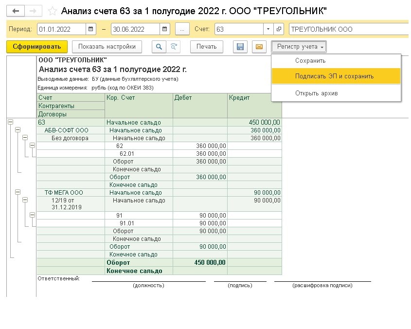 В 1С:Бухгалтерии 8 за основу регистров бухучета приняты стандартные формы отчетности (оборотно-сальдовые ведомости, анализы счетов или субконто, карточки счетов и т.п.). В них включены обязательные реквизиты — ед. изм., должность и подпись ответственного за их ведение лица. Регистры бухучета можно сохранить в архиве, в т.ч. через подписание ЭЦП.