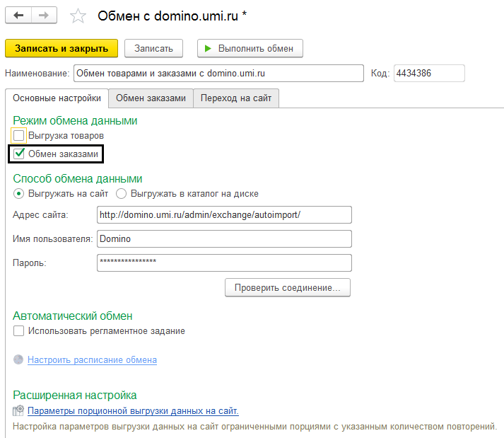 Предоставленные в письме данные можно загрузить в программу. Чтобы это выполнить, необходимо перейти в настройки выгрузки и установить галочку рядом с «Обмен заказами» и на появившейся закладке заполнить параметры.