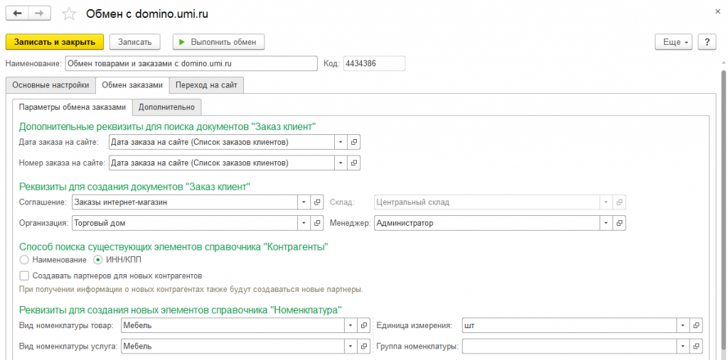 Когда внесенные изменения были указаны, необходимо выполнить обмен с сайтом. Для этого необходимо повторно нажать «Выполнить обмен», предварительно выбрав в разделе «Продажи» –> «Сайт компании» –> «Обмен с сайтом» необходимую настройку.
