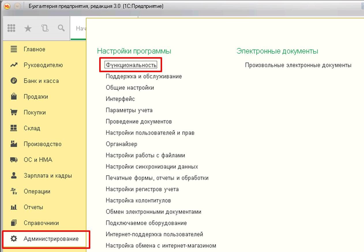 Для нормальной работы данного раздела 1С, потребуется выполнить некоторые подстройки программы. Первым делом включим необходимые нам функции, для чего перейдем в раздел «Администрирование»: