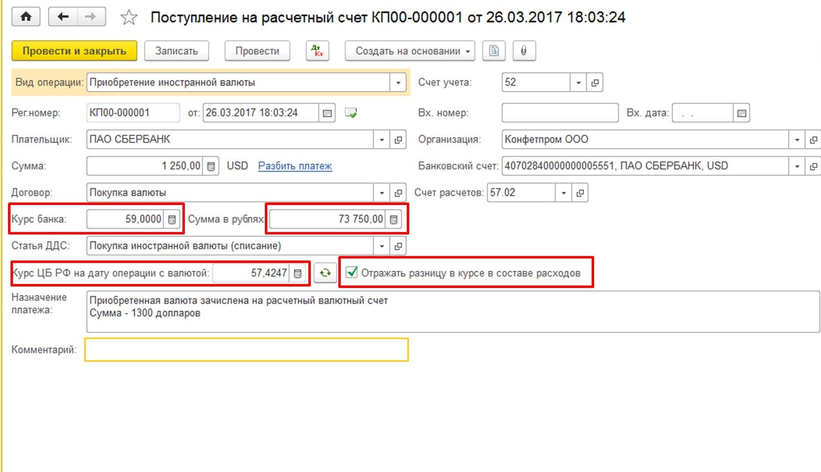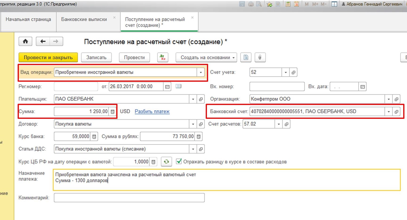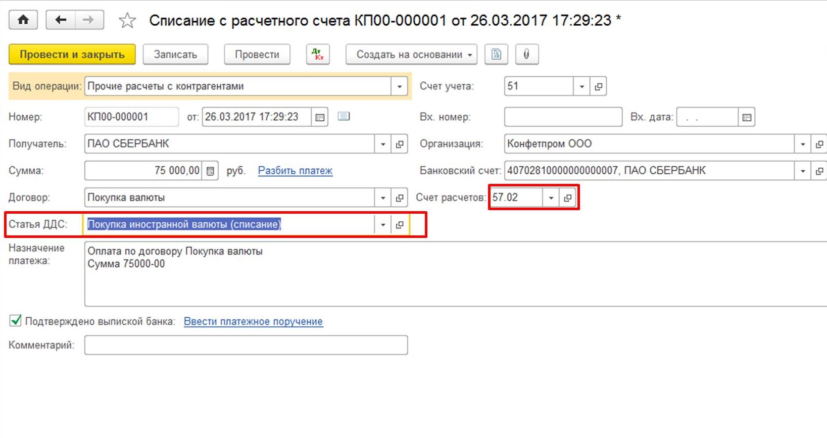 В момент покупки валюты банк выполнит списание необходимой для этого суммы со счета организации-покупателя. Оформление этой операции в 1С:
